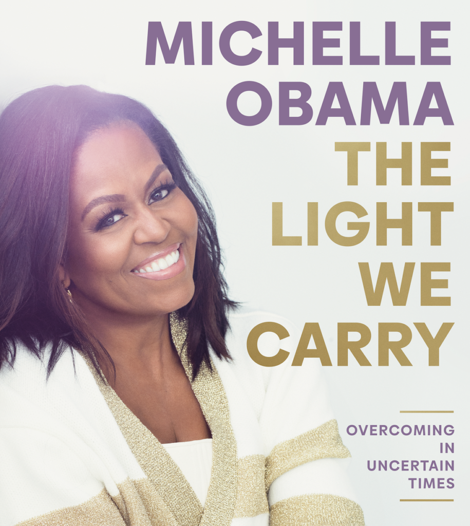 “In THE LIGHT WE CARRY, Mrs. Obama offers readers a series of fresh stories and insightful reflections on change, challenge, and power, including her belief that when we light up for others, we can illuminate the richness and potential of the world around us, discovering deeper truths and new pathways for progress. Drawing from her experiences as a mother, daughter, spouse, friend, and First Lady, she shares the habits and principles she has developed to successfully adapt to change and overcome various obstacles—the earned wisdom that helps her continue to “become.” She details her most valuable practices, like “starting kind,” “going high,” and assembling a “kitchen table” of trusted friends and mentors. With trademark humor, candor, and compassion, she also explores issues connected to race, gender, and visibility, encouraging readers to work through fear, find strength in community, and live with boldness.”